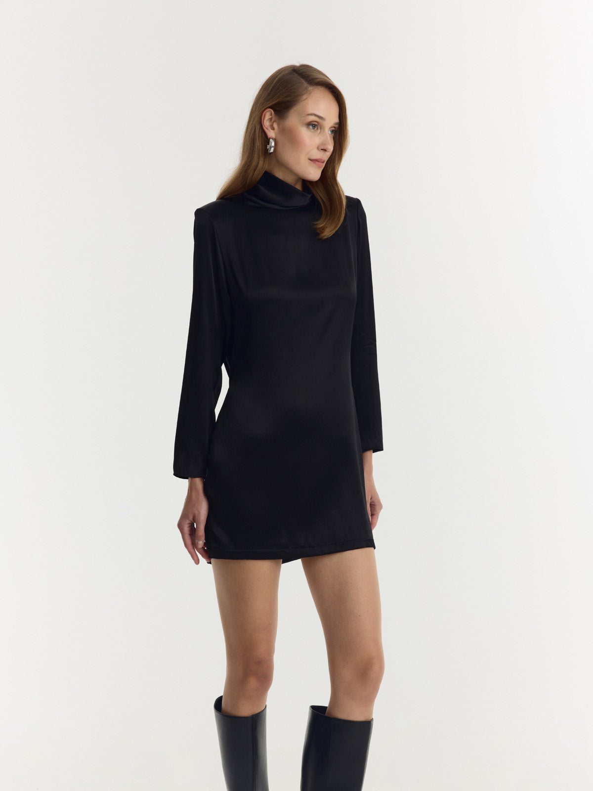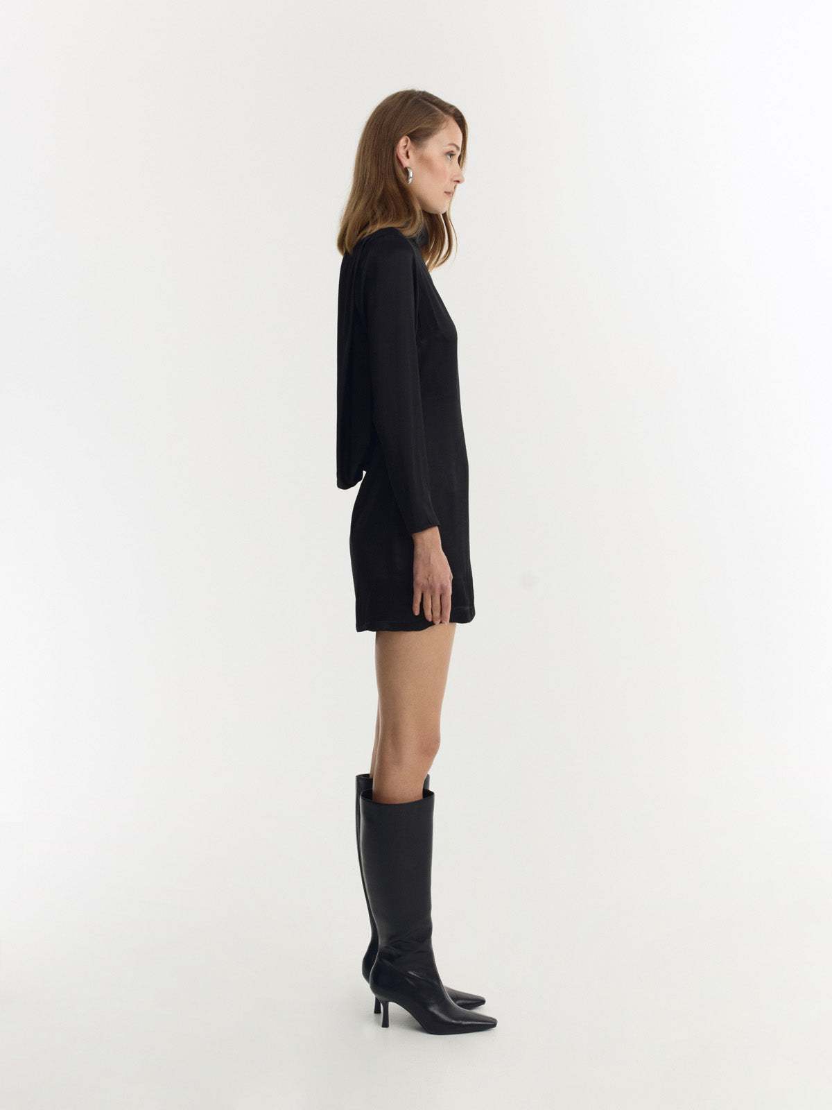 Vestido corto confeccionado en 100% viscosa negra con acabado satinado. Mangas largas, impresionante espalda abierta drapeada y hombros estructurados que crean una silueta elegante y fluida.