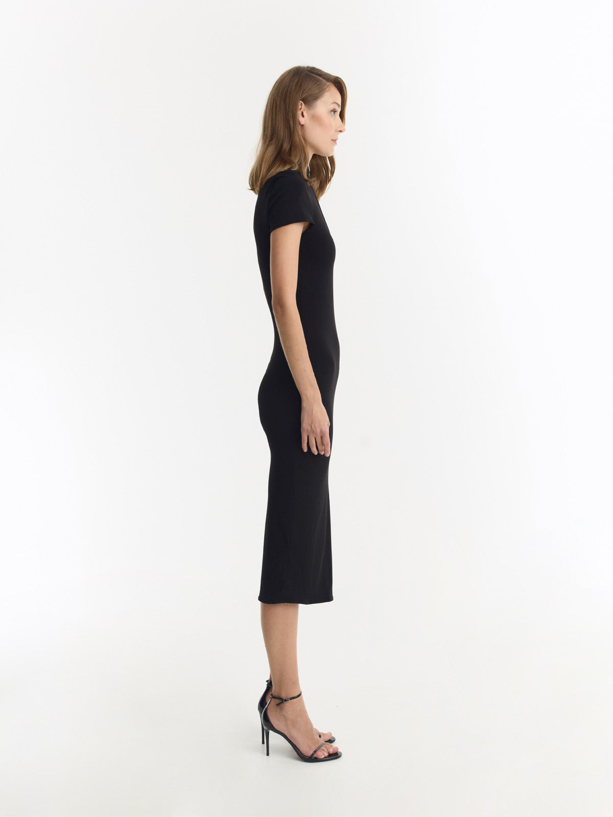 Vestido midi negro en poliéster reciclado, con un cuello abotonado que crea una sutil abertura en forma de ojo de cerradura. Terminado con mangas cortas, ofrece una silueta limpia y moderna con un toque chic sin esfuerzo.