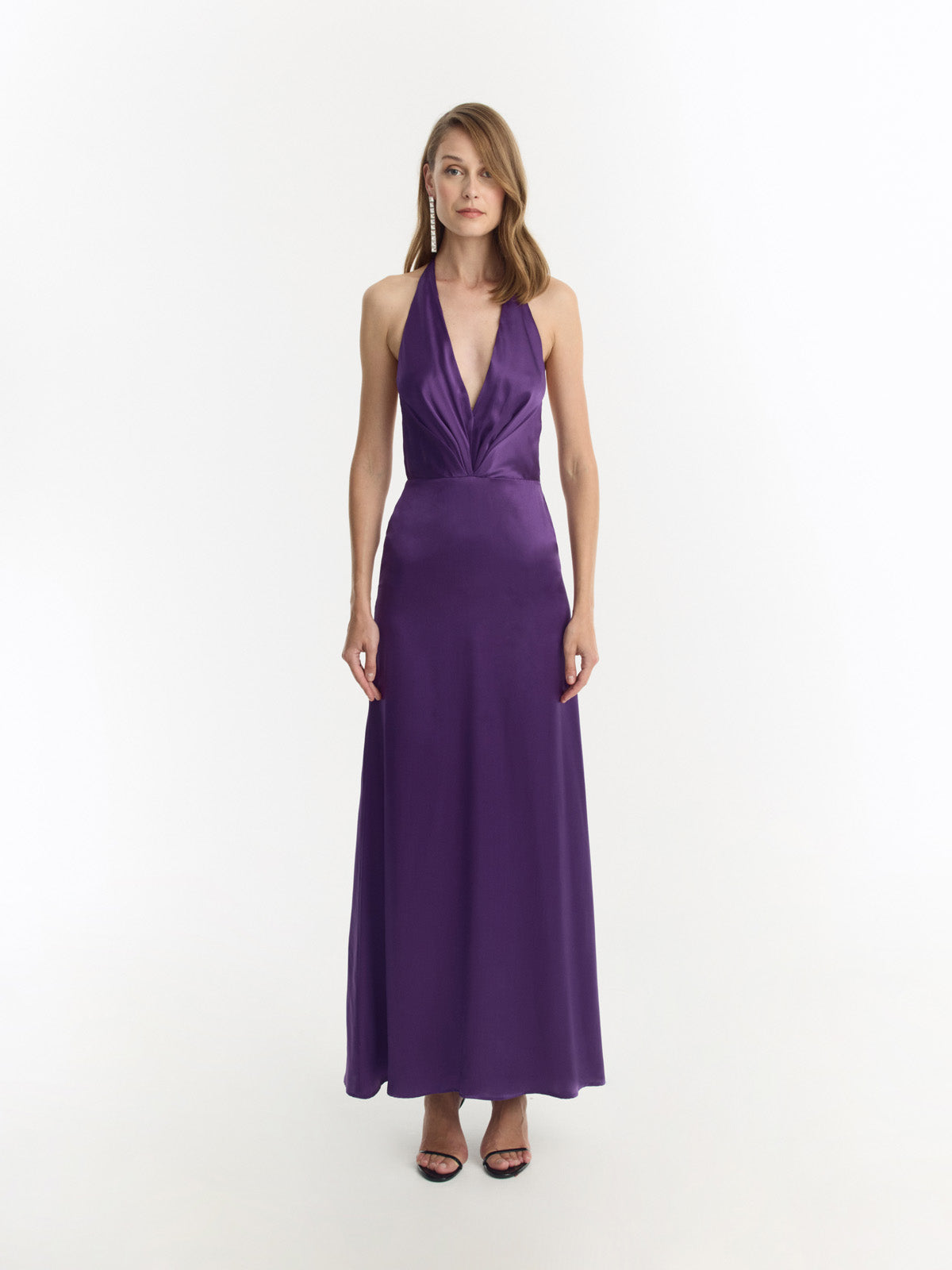 Vestido confeccionado en 100% seda satinada púrpura, con escote en V y cuello halter, cintura ajustada y detalles drapeados. Elegante y delicado, perfecto para un conjunto llamativo y sofisticado.