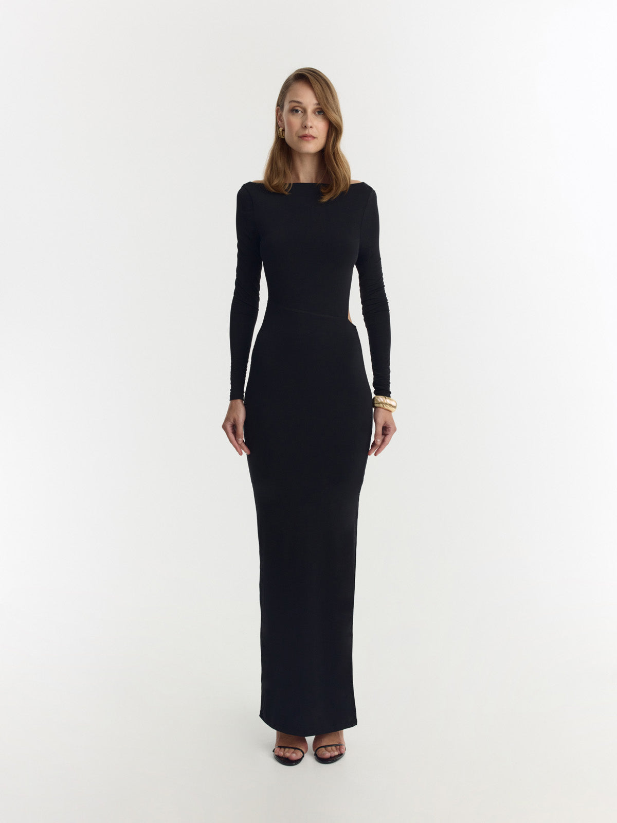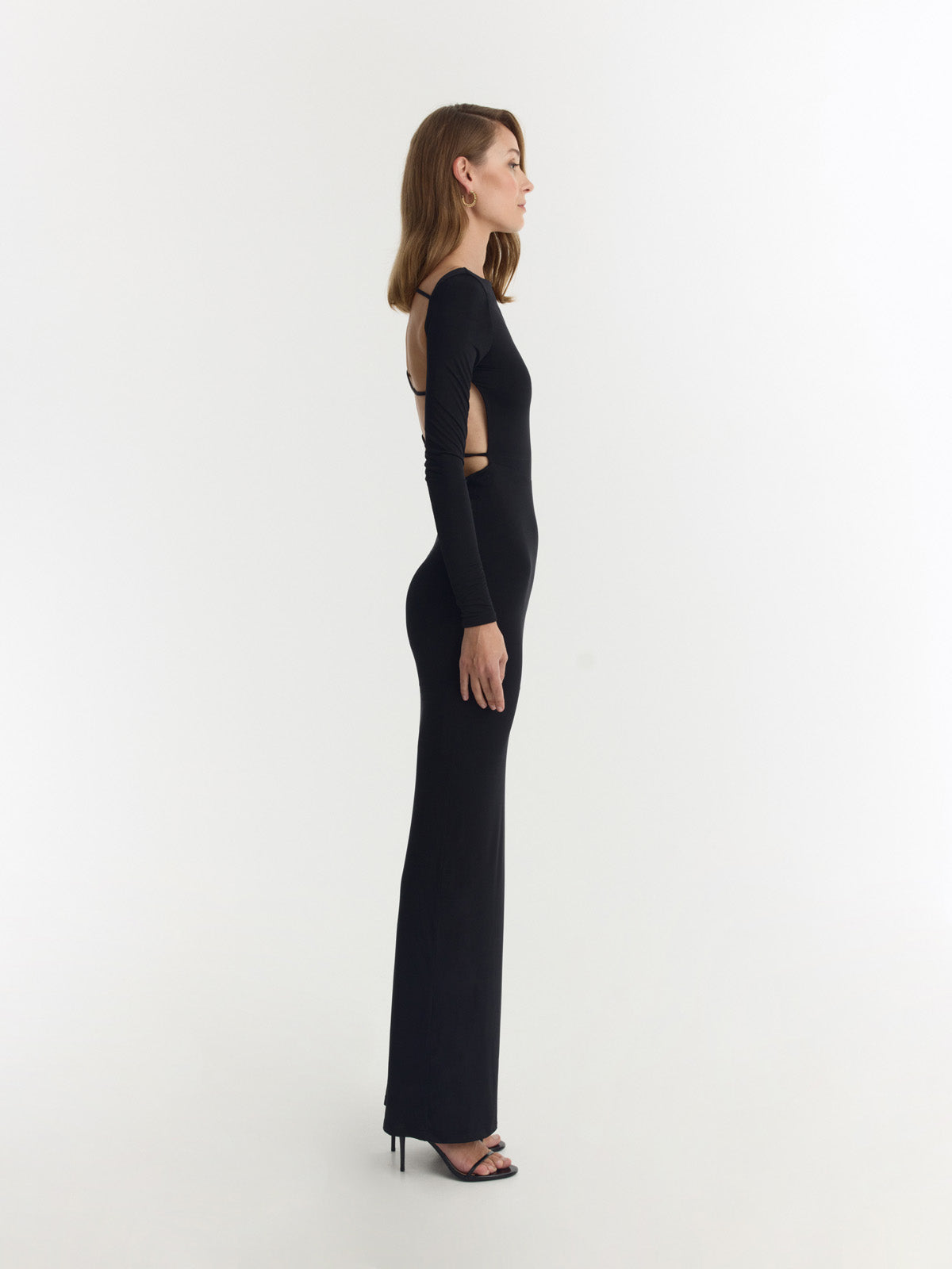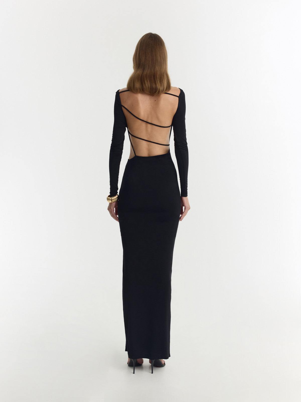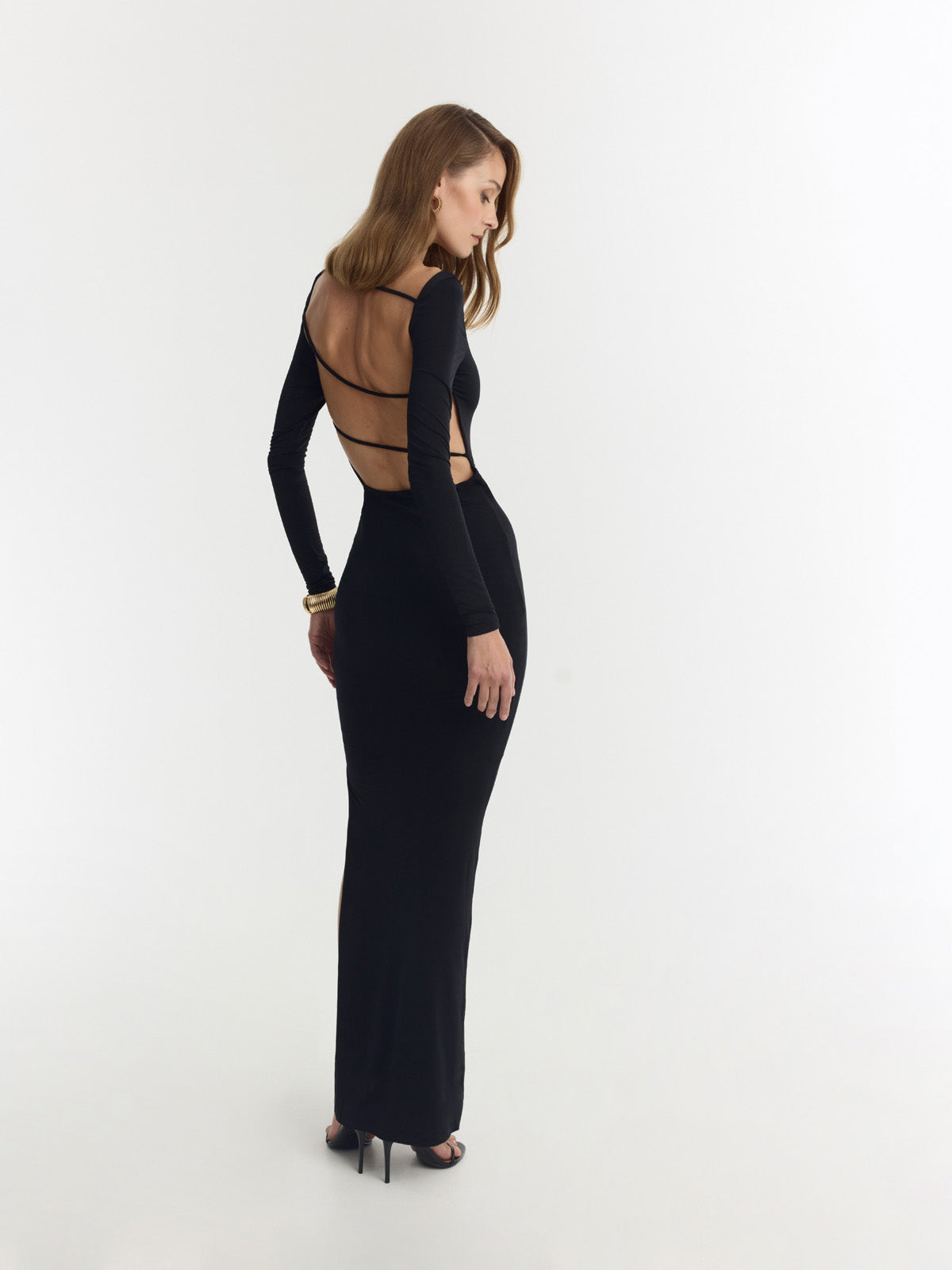 Vestido largo negro en poliéster reciclado, escote barco, mangas largas y una abertura lateral. La espalda descubierta está sostenida por tirantes delgados que se cruzan de forma asimétrica, creando una silueta elegante y moderna con un toque refinado y sofisticado.