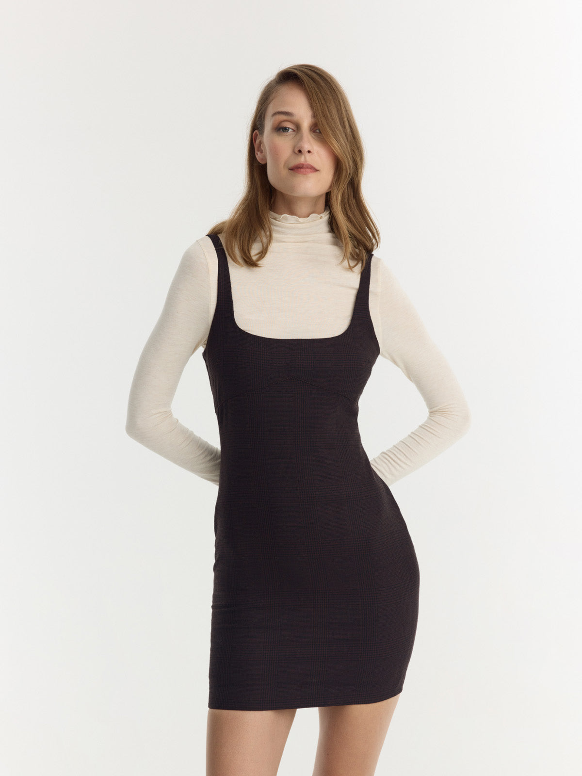 Vestido corto confeccionado en lana y viscosa, con tirantes gruesos y escote cuadrado. Una silueta elegante y moderna, perfecta para un conjunto pulido.
