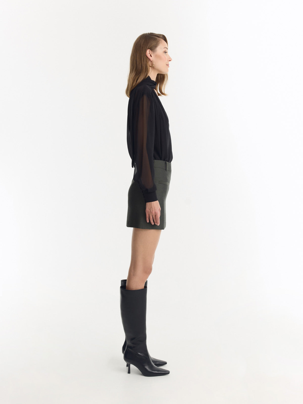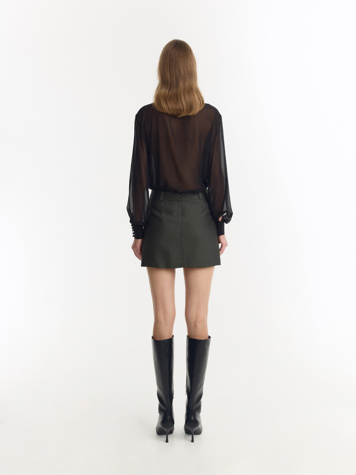 Mini-jupe vert olive, conçue pour s'associer parfaitement avec le blazer assorti pour un look raffiné et élégamment décontracté.