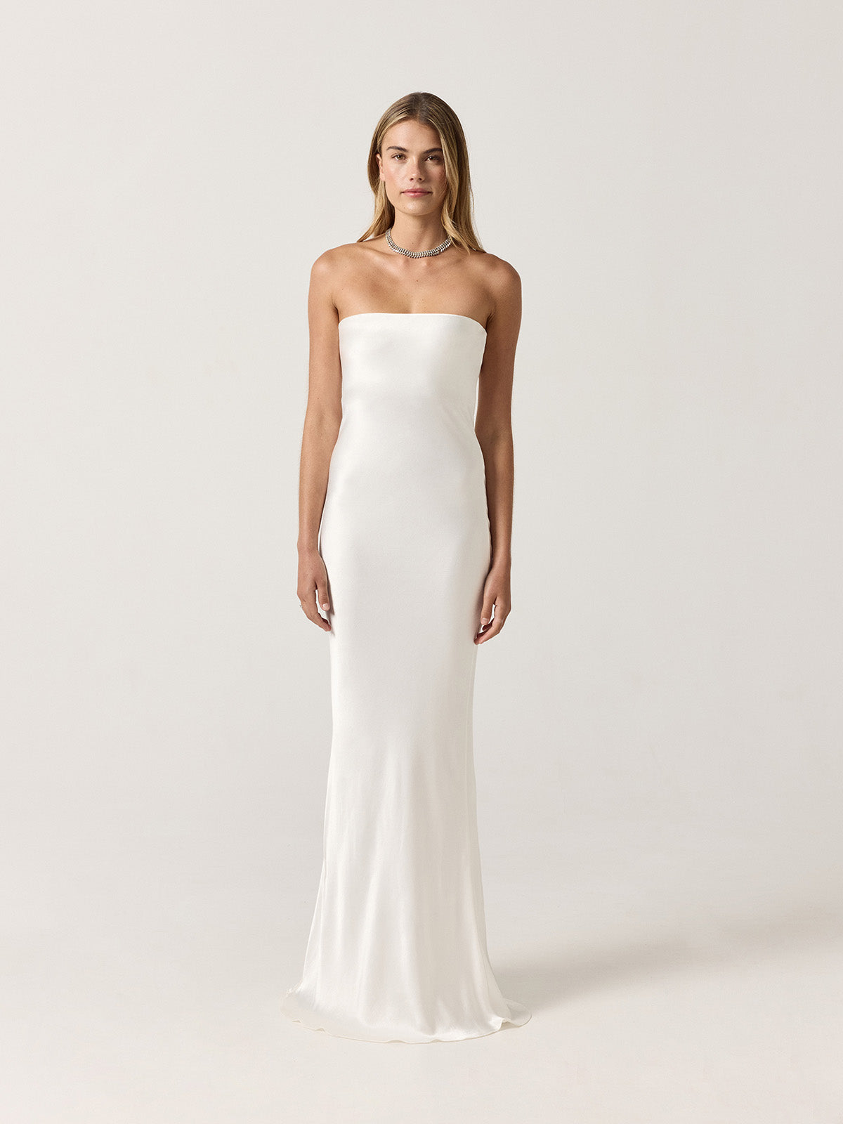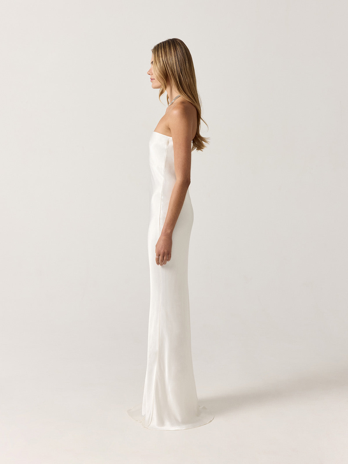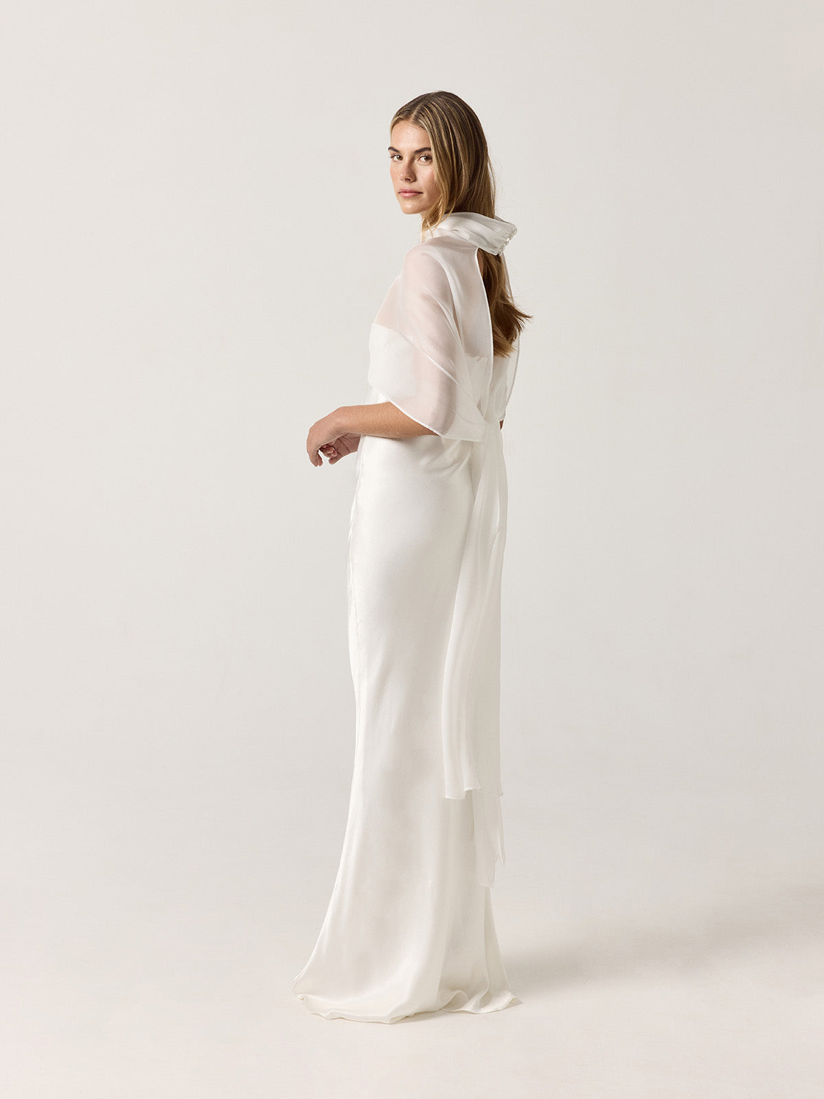 Notre design emblématique, confectionné en satin blanc ivoire et coupé dans le biais, épouse le corps comme une seconde peau. Associé à notre cape Gabriela assortie, il crée une silhouette éthérée et sophistiquée.