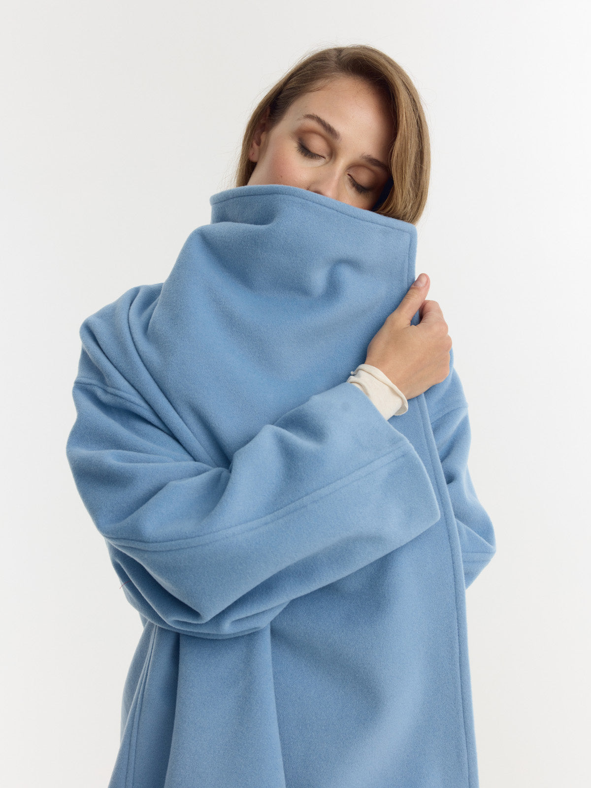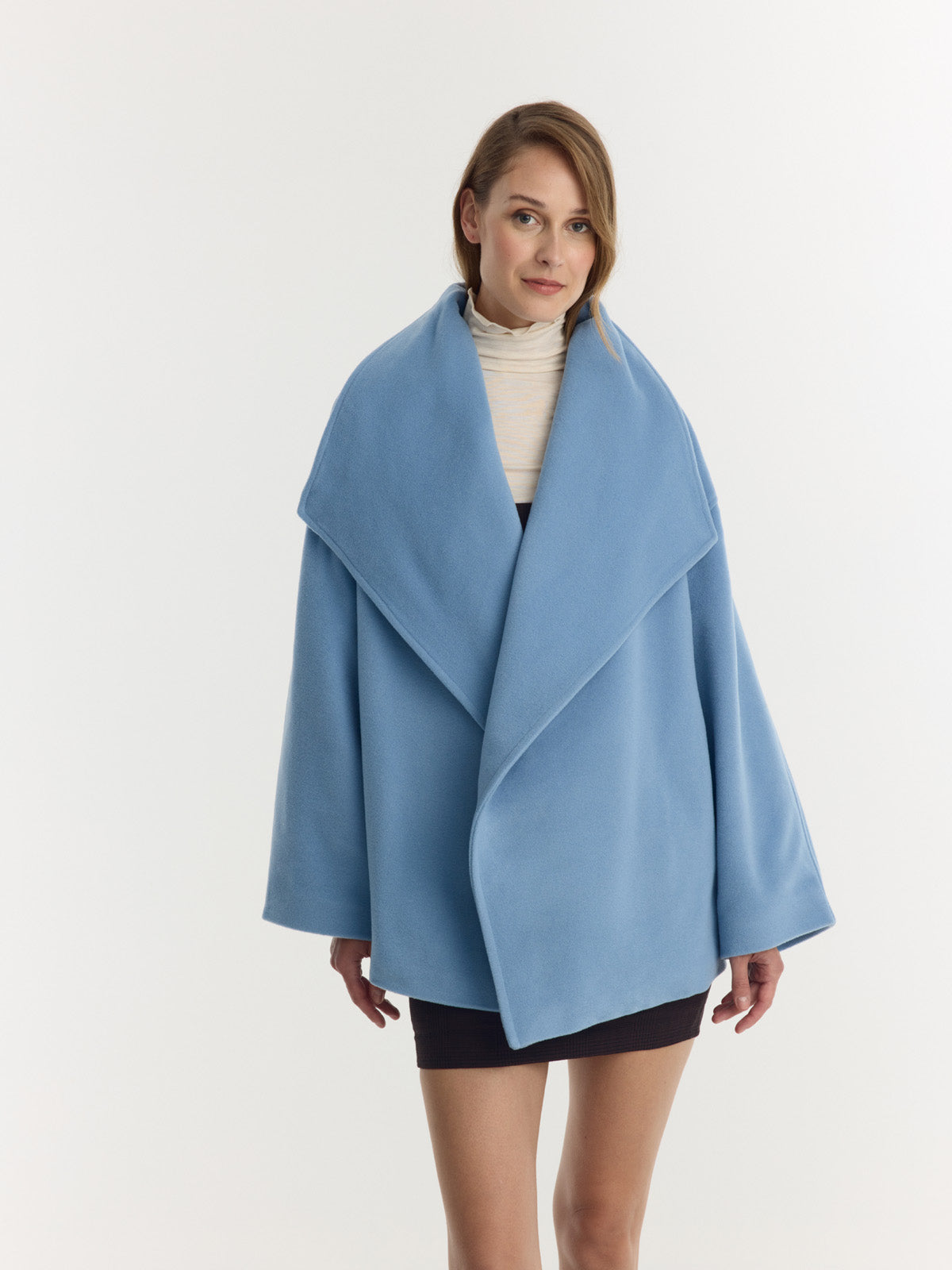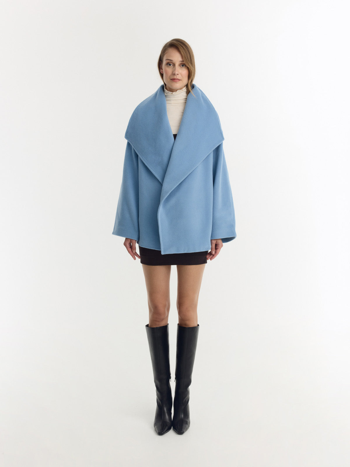 Cappotto azzurro chiaro realizzato in 100% lana, che arriva fino ai fianchi con grandi rever che possono essere modellati in modi diversi per una copertura versatile e maniche larghe. Un capo chic e accogliente per un outfit raffinato.