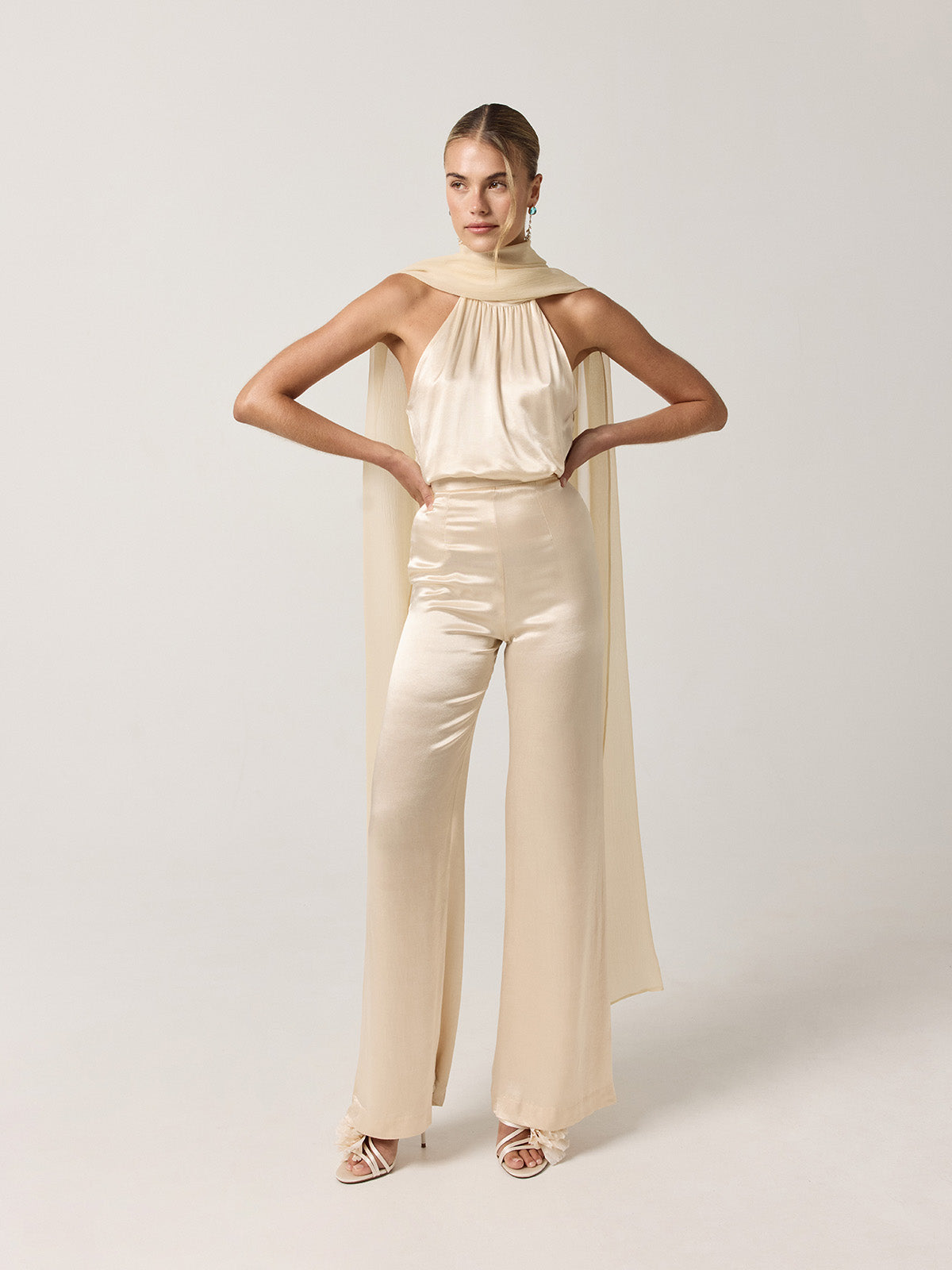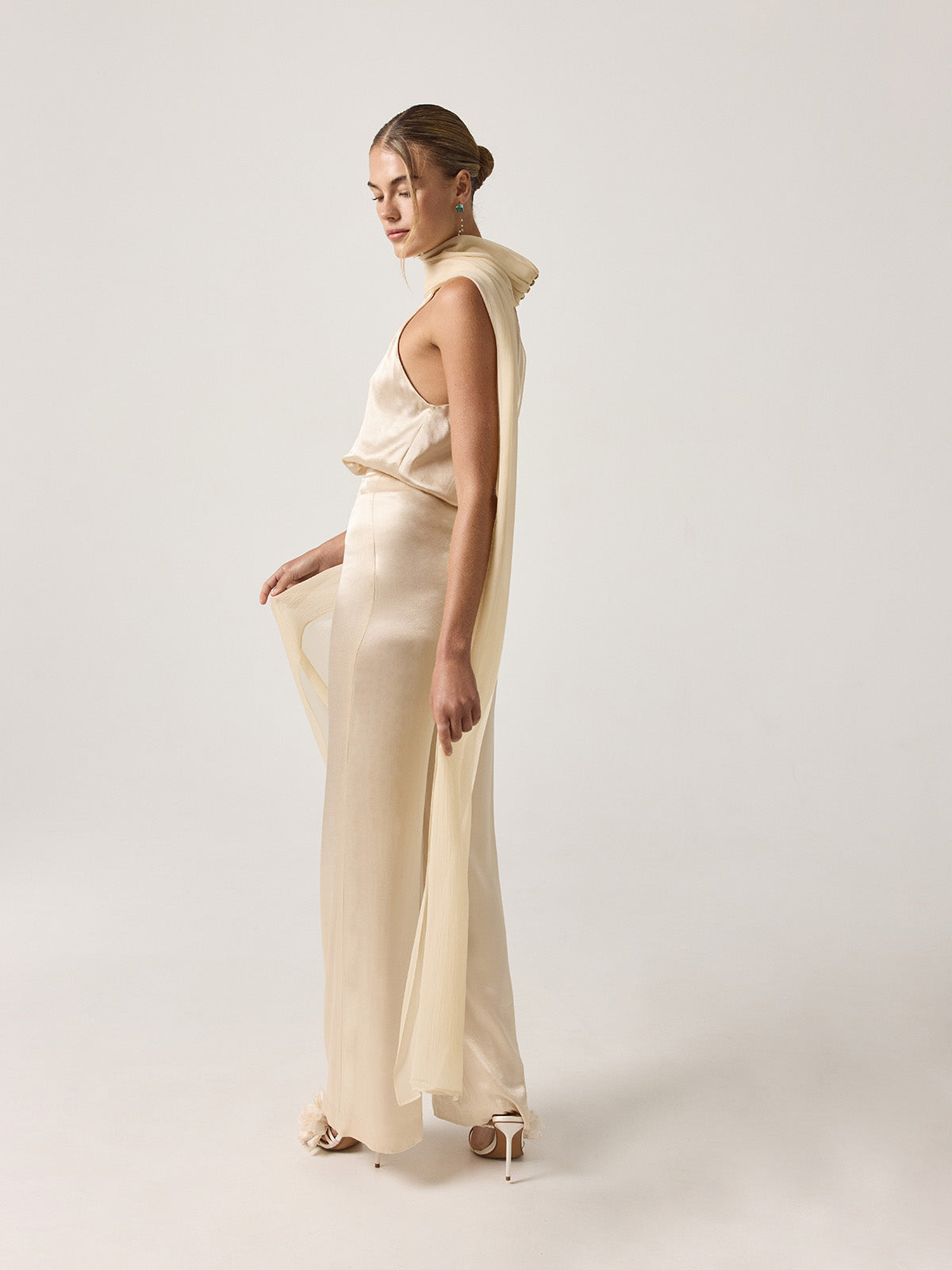 Semi-transparent cape with a halter neckline, crafted from 100% cream silk chiffon. Its fluid design enhances the natural movement of the fabric, creating a piece that is both sophisticated and light. Ideal to layer over evening looks for an elegant statement.