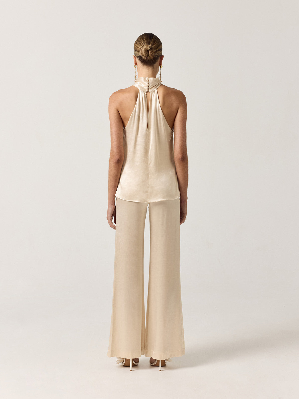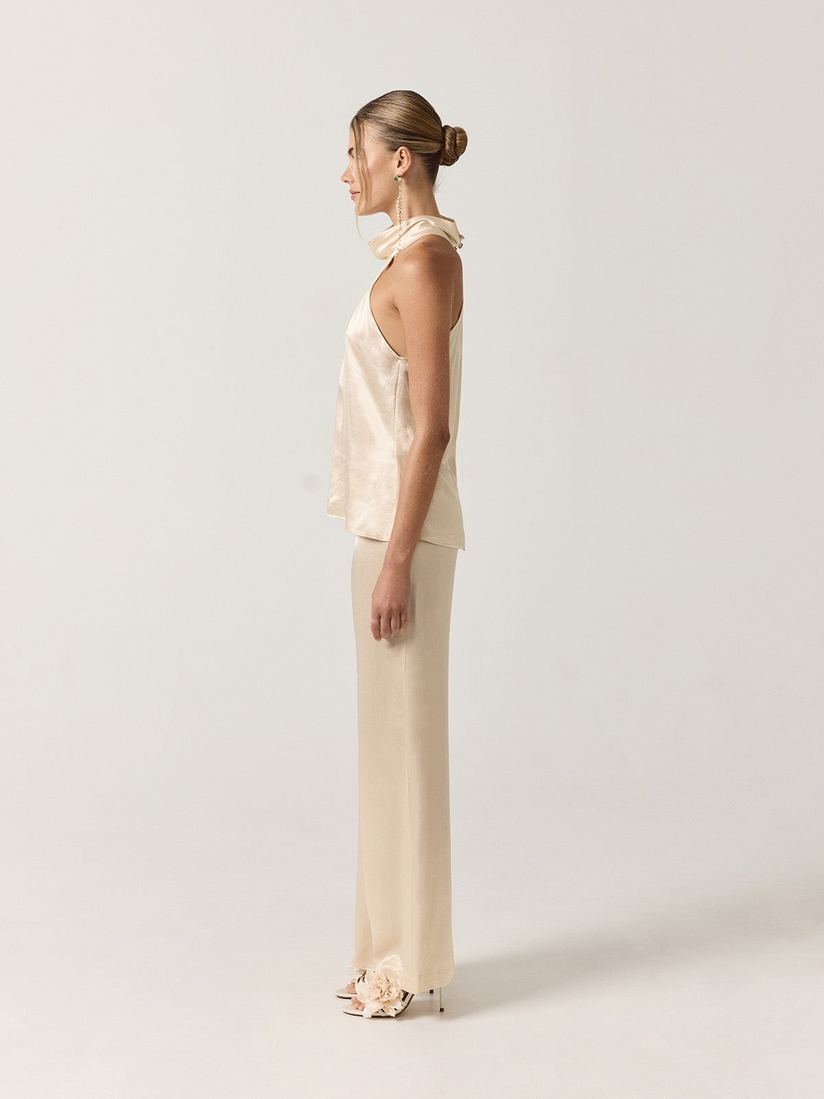 "Cream halter top crafted in satin, defined by a fluid silhouette and a refined, elegant finish. Designed to pair perfectly with the Elise Pants in cream and completed with the Gabriela Cape for a polished bridal look. Ideal for a civil ceremony, rehearsal dinner, or relaxed wedding celebration.