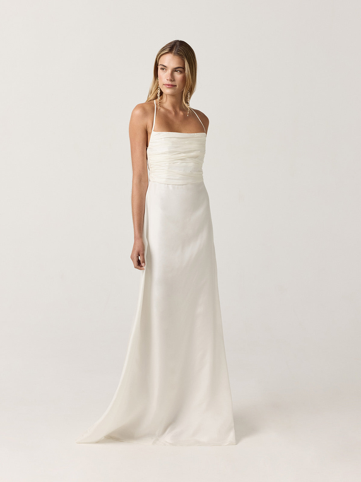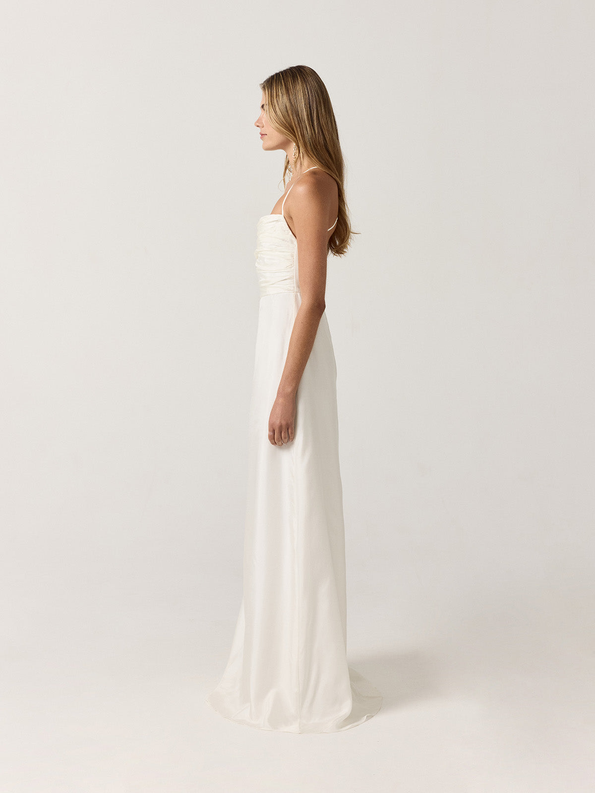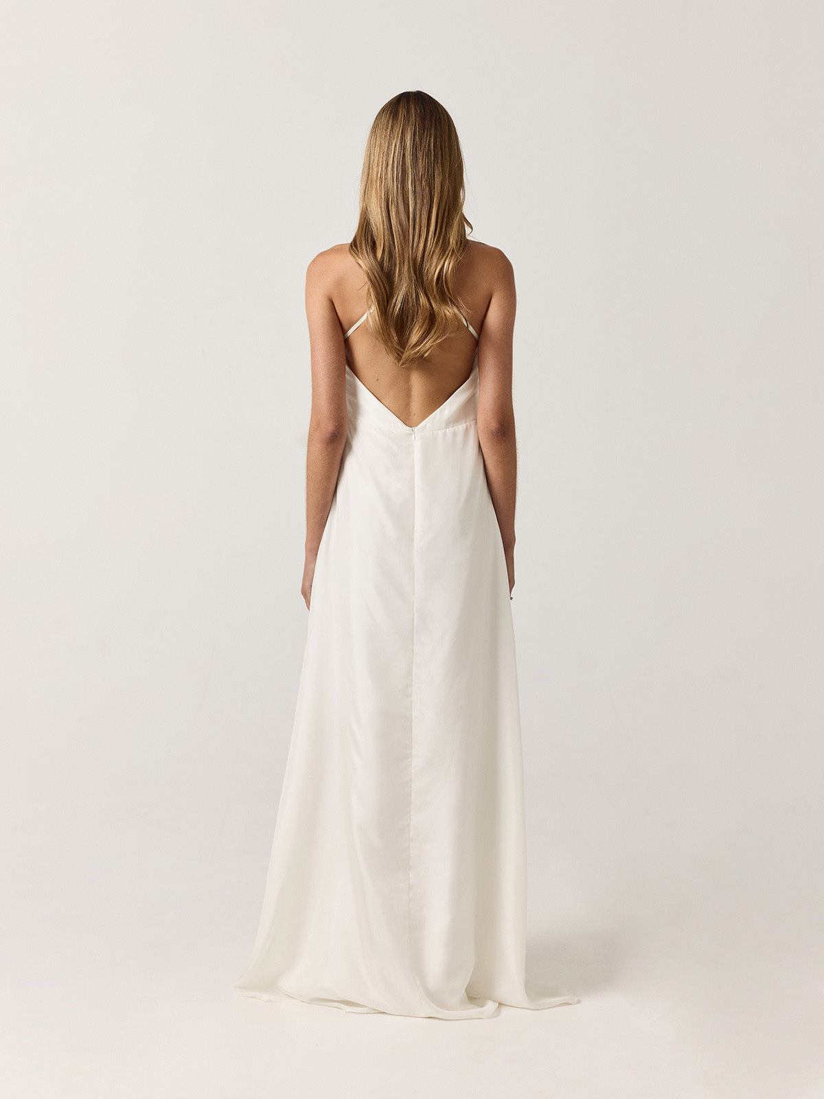 Ivory white long dress crafted in 100% silk, featuring a softly draped bodice with fine straps and a straight neckline. Designed with delicate crossed straps at the back and finished with an invisible zipper closure. One of the collection’s most versatile pieces, ideal for a modern and romantic bridal look.