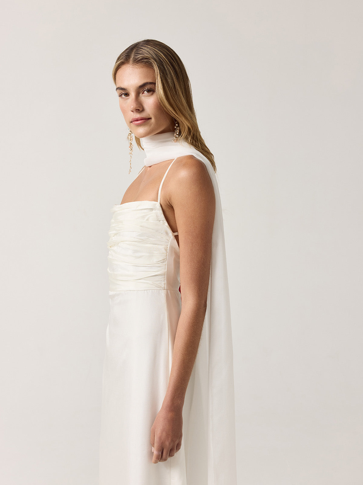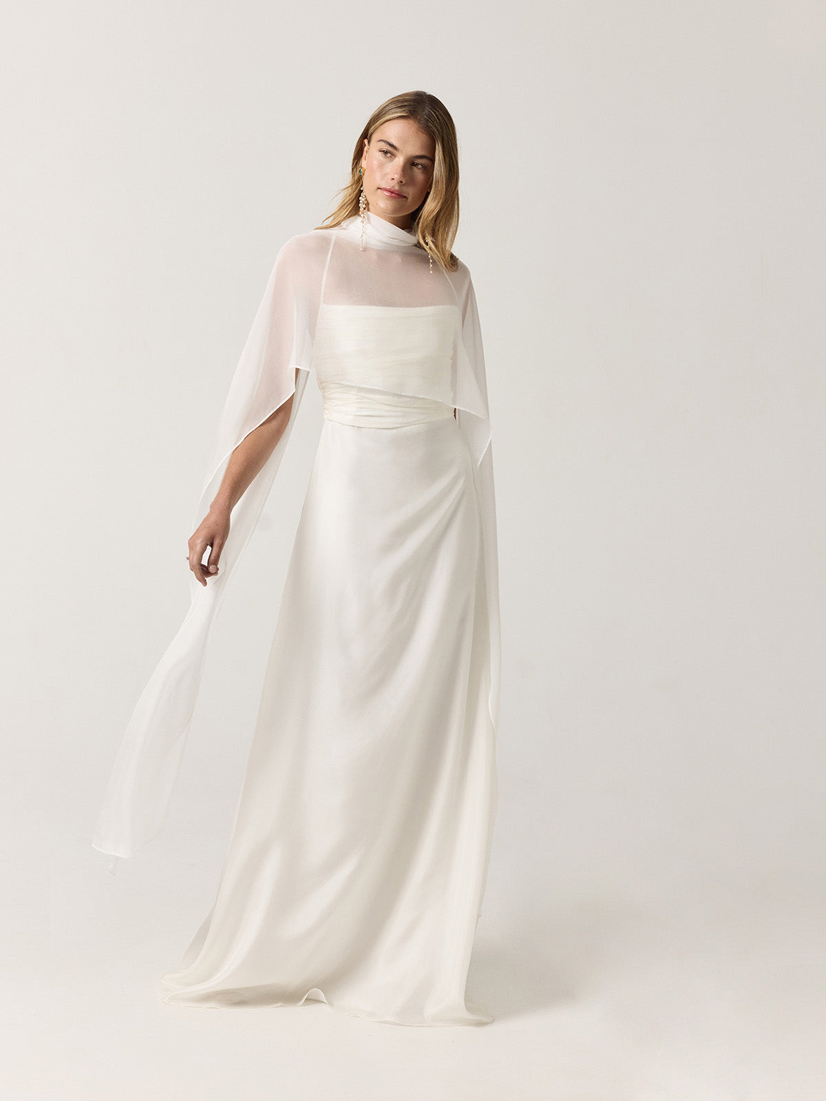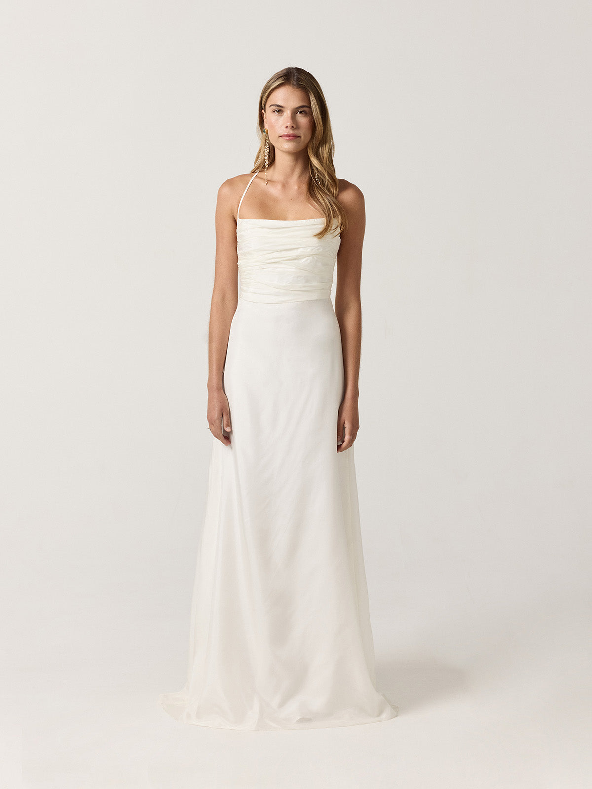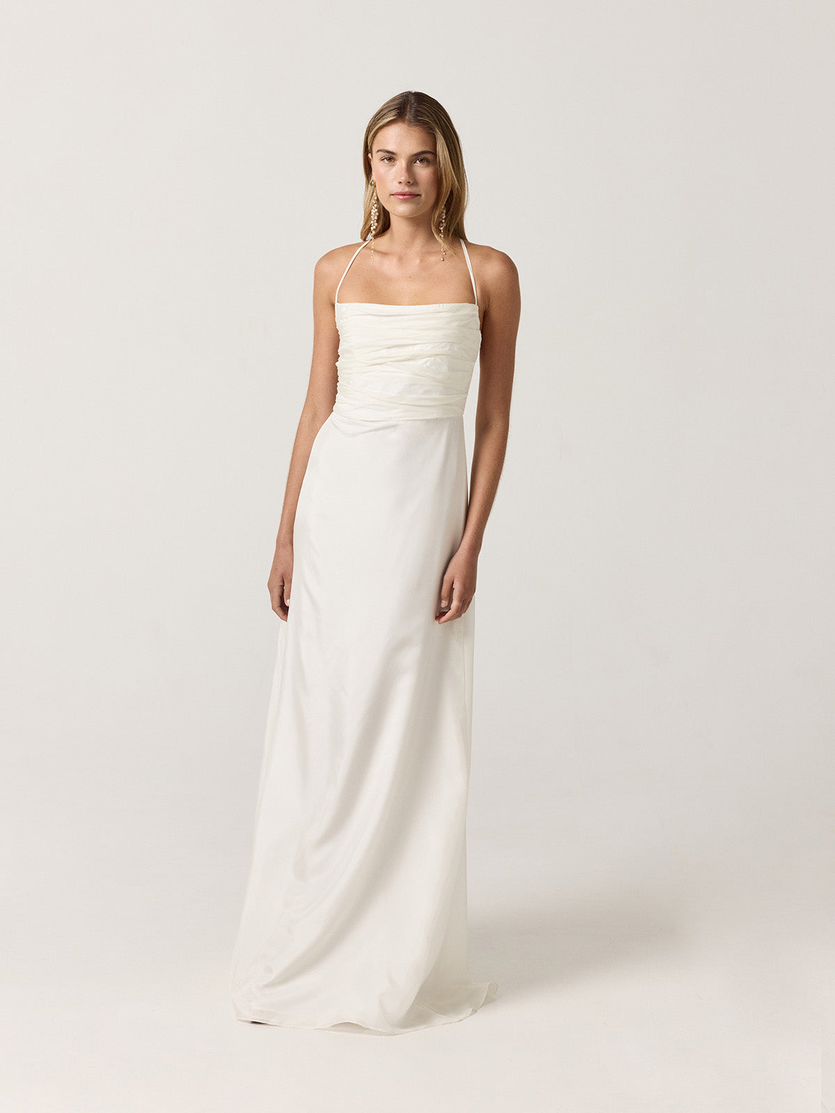 Ivory white long dress crafted in 100% silk, featuring a softly draped bodice with fine straps and a straight neckline. Designed with delicate crossed straps at the back and finished with an invisible zipper closure. One of the collection’s most versatile pieces, ideal for a modern and romantic bridal look.