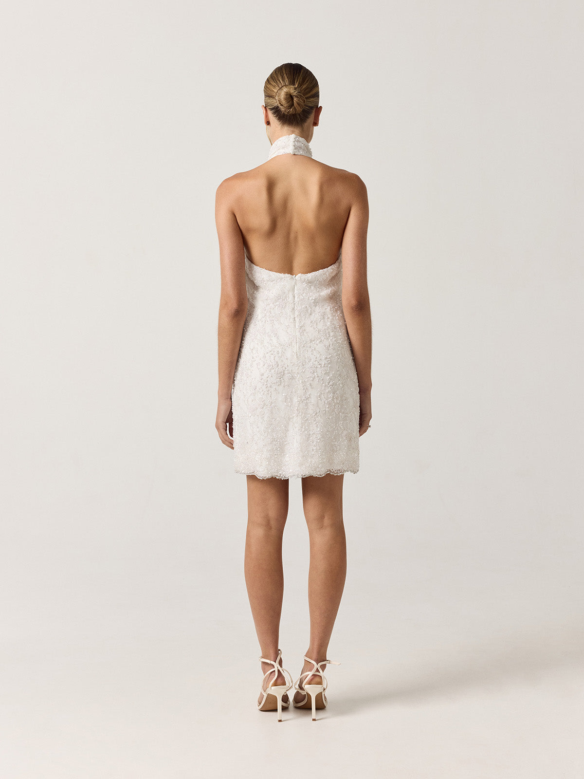 Short white halter dress crafted in an all-over embroidered fabric, defined by a fitted silhouette. Playful yet refined, this limited-edition design is perfect for bridal parties, second dresses, or celebrations that call for timeless elegance with a joyful twist.
